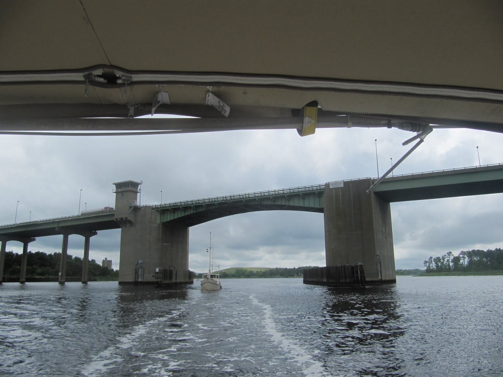 We left the Dismal Swamp Canal and turned into the Elizabeth River going upstream toward Portsmouth and Norfolk, VA. This bridge is kind of the dividing line between peace and solitude and our new world of noise, large ships and cranes, more noise, factorys, industrial sized trash dumps and other installations along the shore and the associated aromas in the air